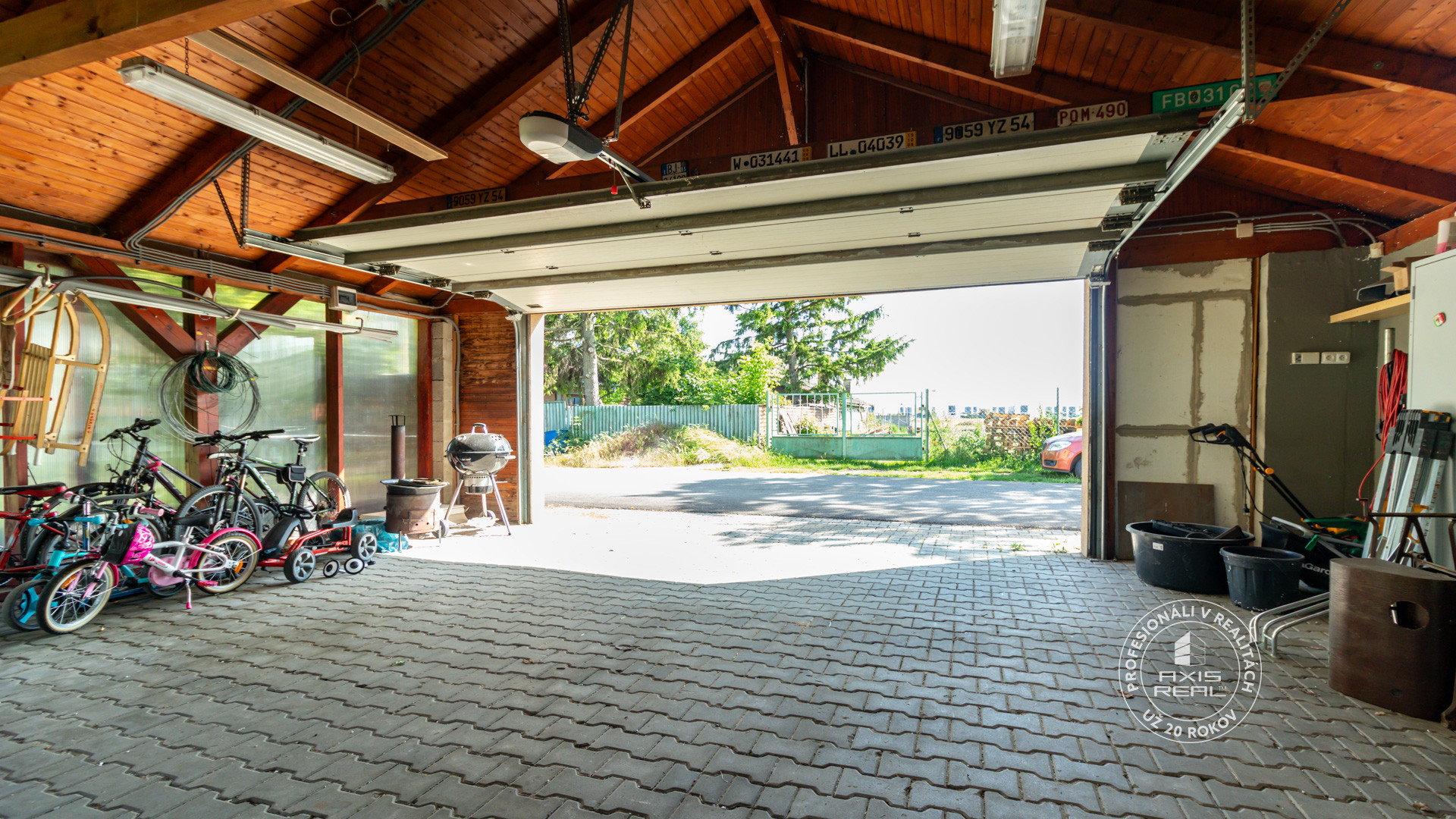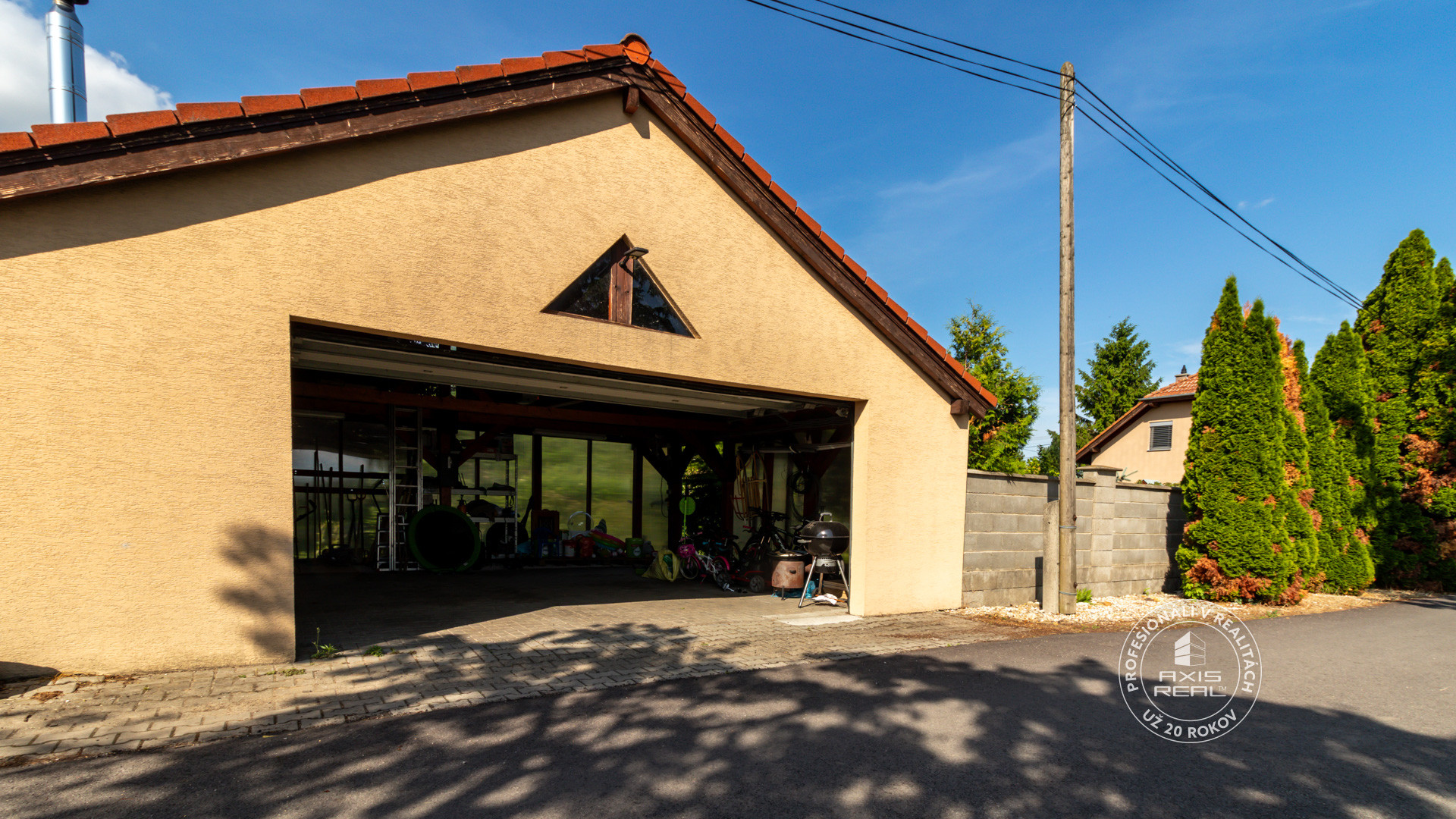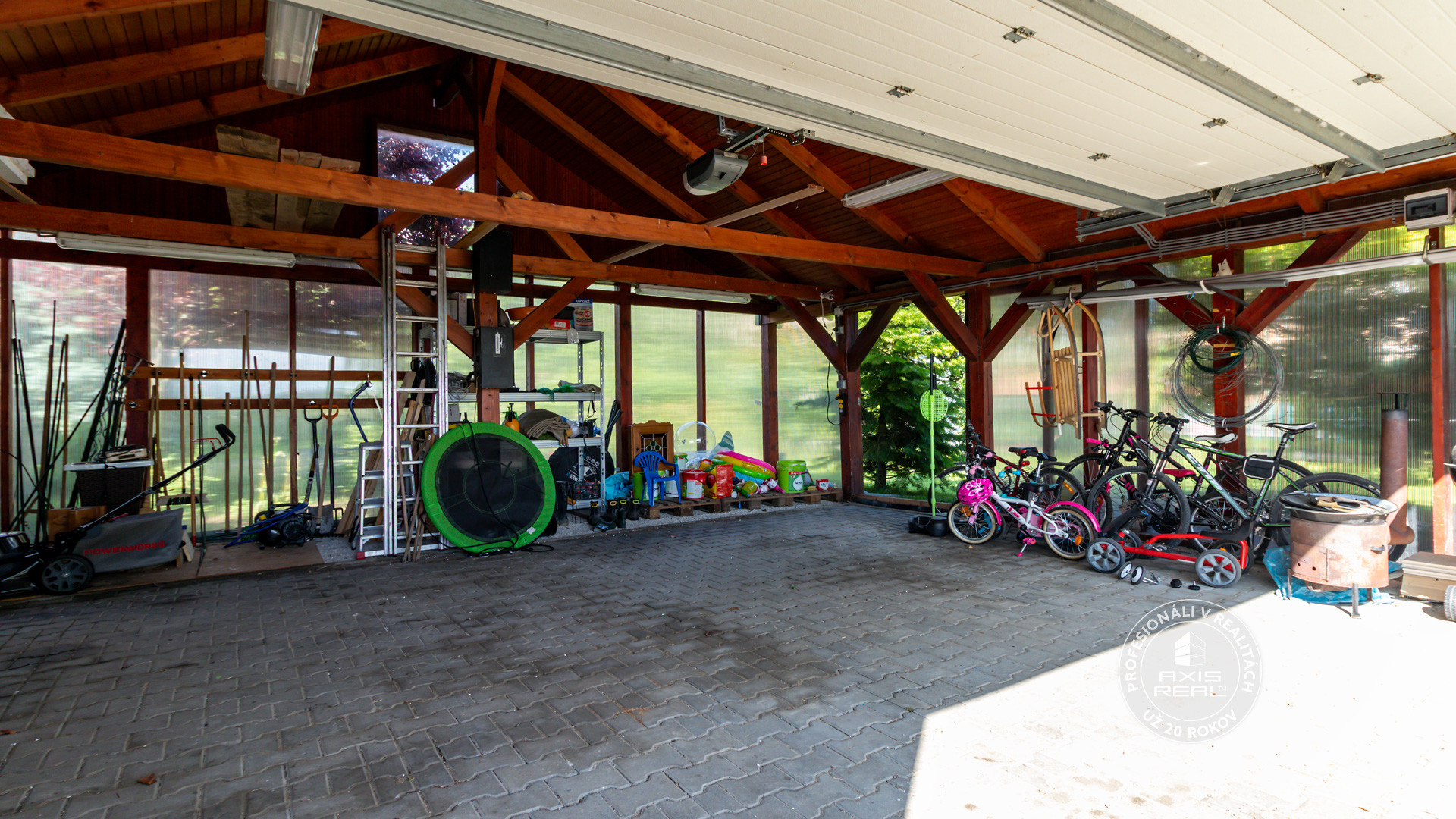 ❷ Samostatne stojaca GARÁŽ 7.5 x 7,5 m s krbom a bránou na DO, altánok na pozemku