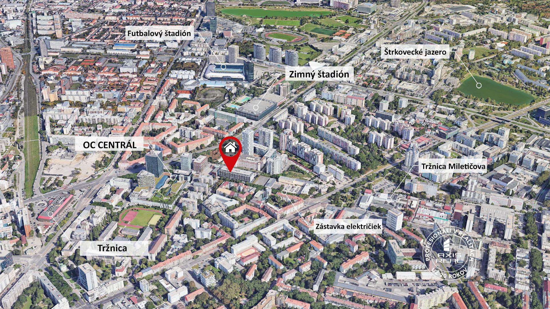 Tento byt sa nachádza v jednej z najvyhľadávanejších lokalít Bratislavy, ktorá ponúka výbornú dostupnosť do centra mesta. V bezprostrednom okolí nájdete kompletnú občiansku vybavenosť, vrátane zastávok MHD, nákupného centra CENTRÁL, Trhoviska „Miletičova“, obchodov, reštaurácií, kaviarní a ďalších služieb.