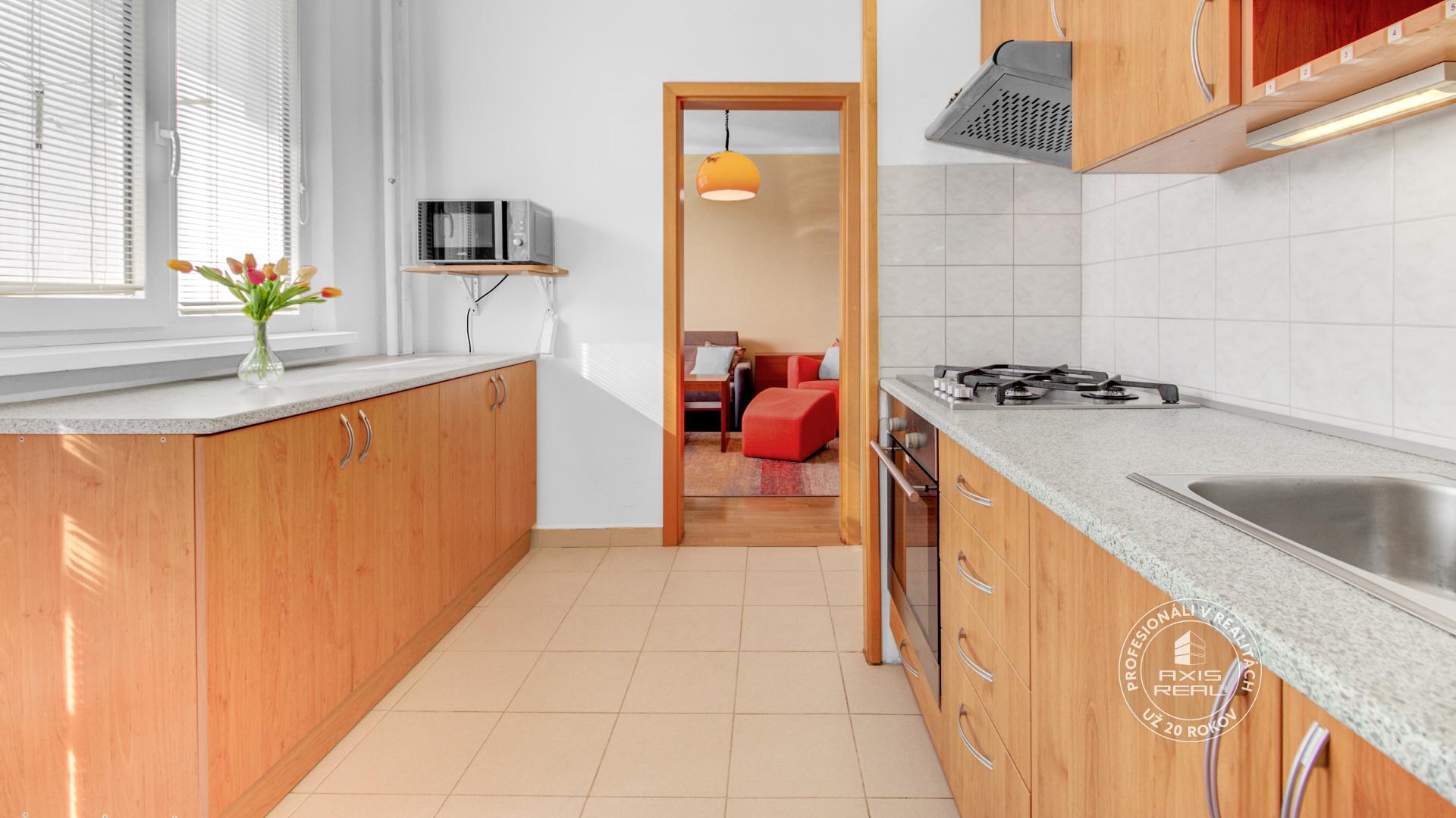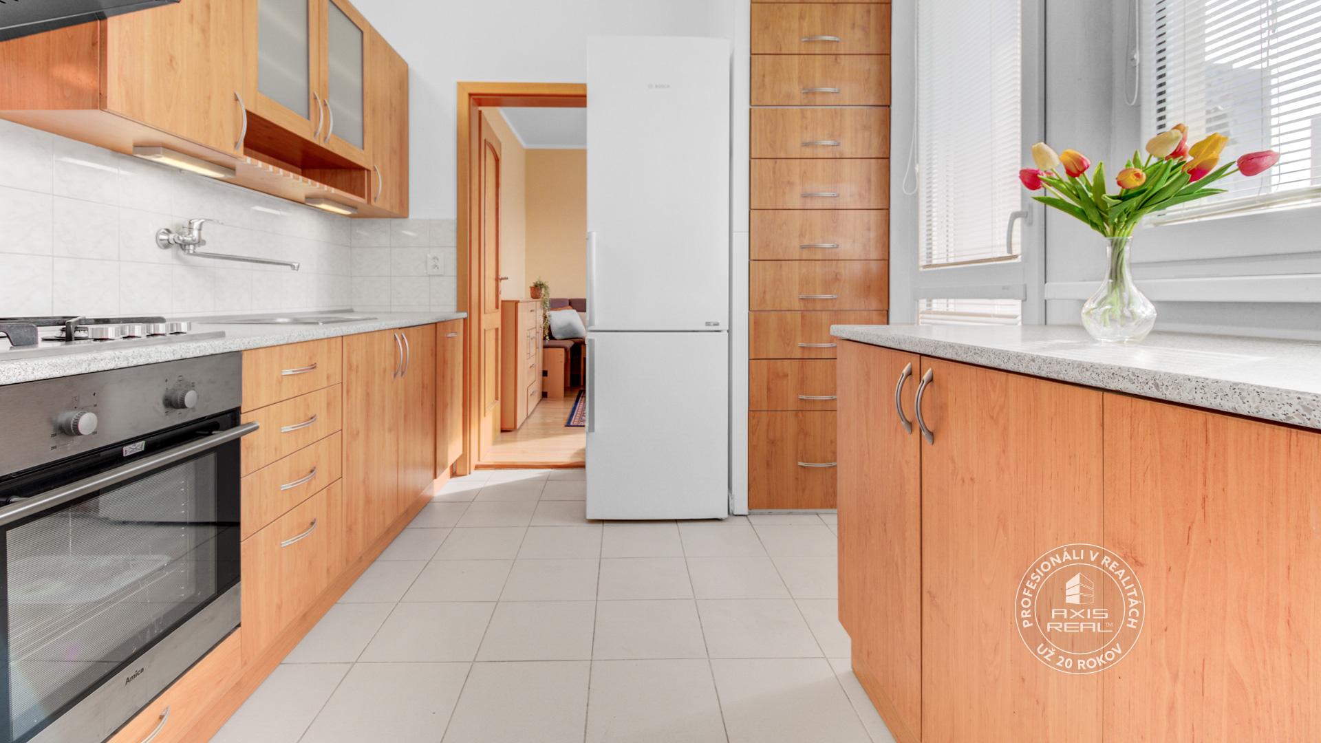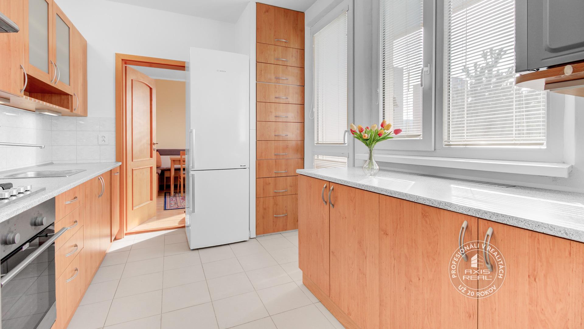 Zrekonštruovaný byt. V kuchyni je kuchynská linka s kombinovaným sporákom, prípojkou na umývačku riadu, chladničkou s mrazničkou a vstavanou šuplíkovou potravinovou skrinkou.