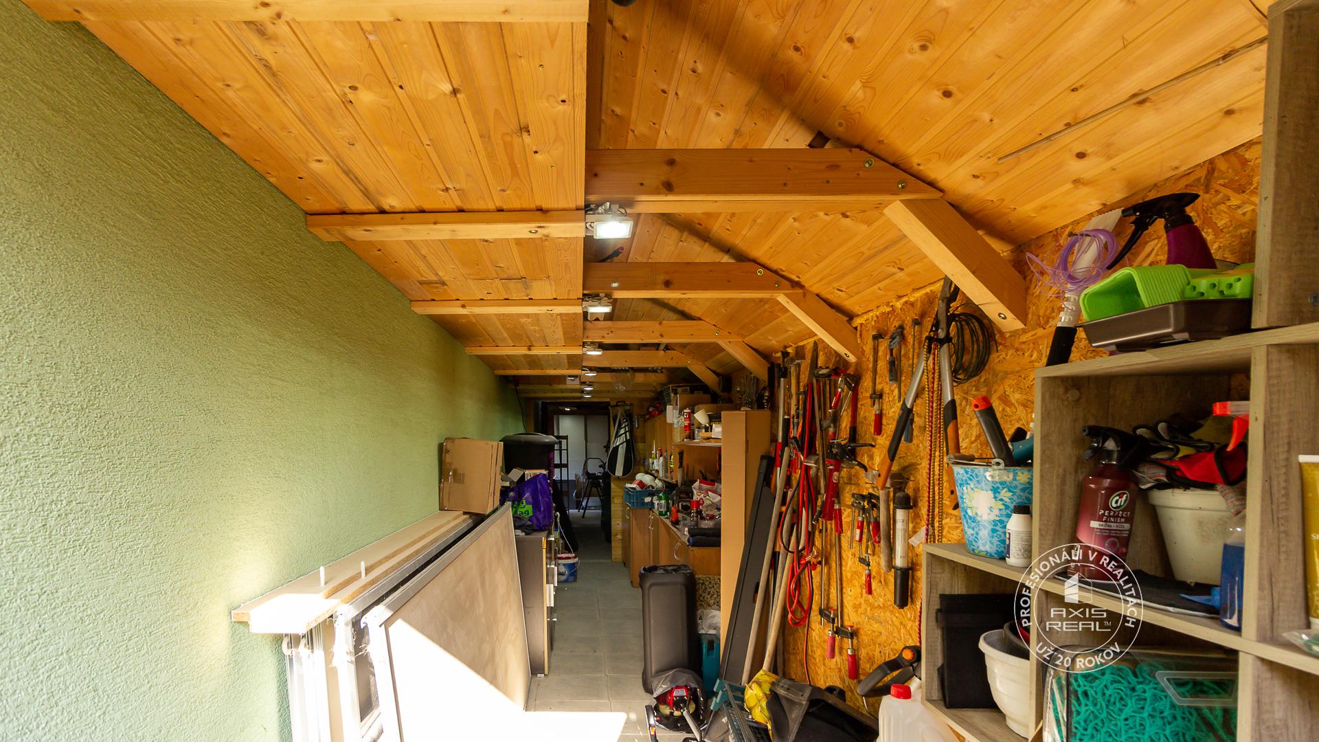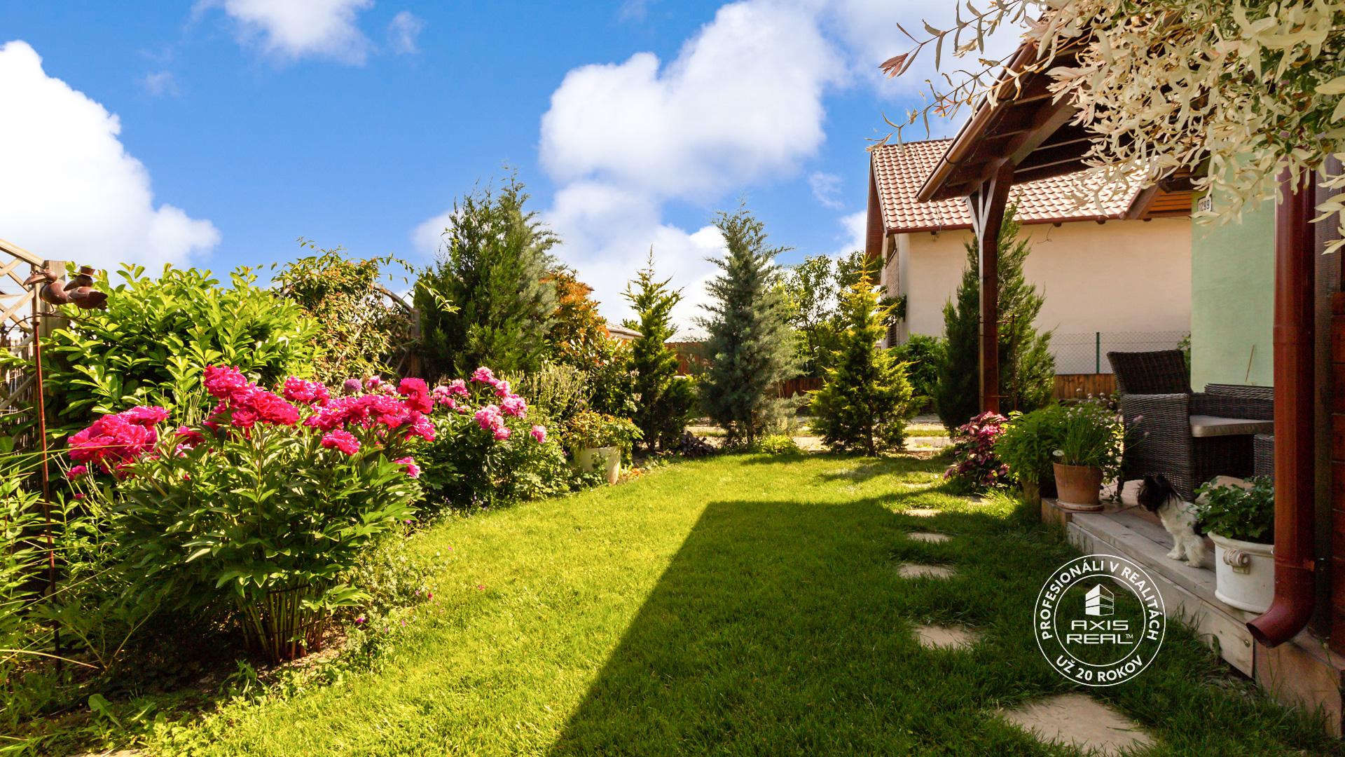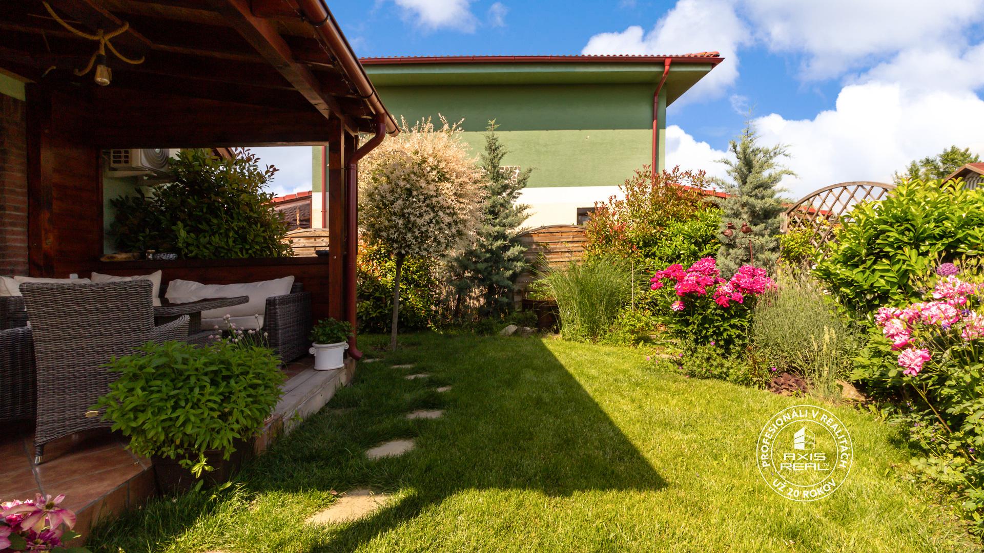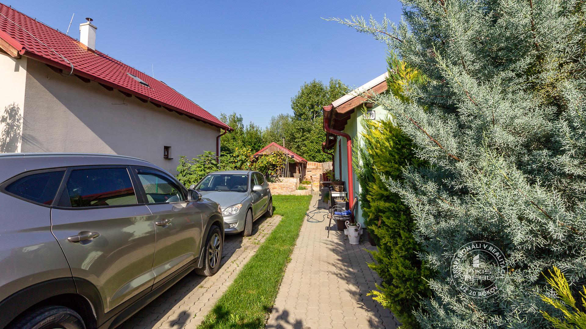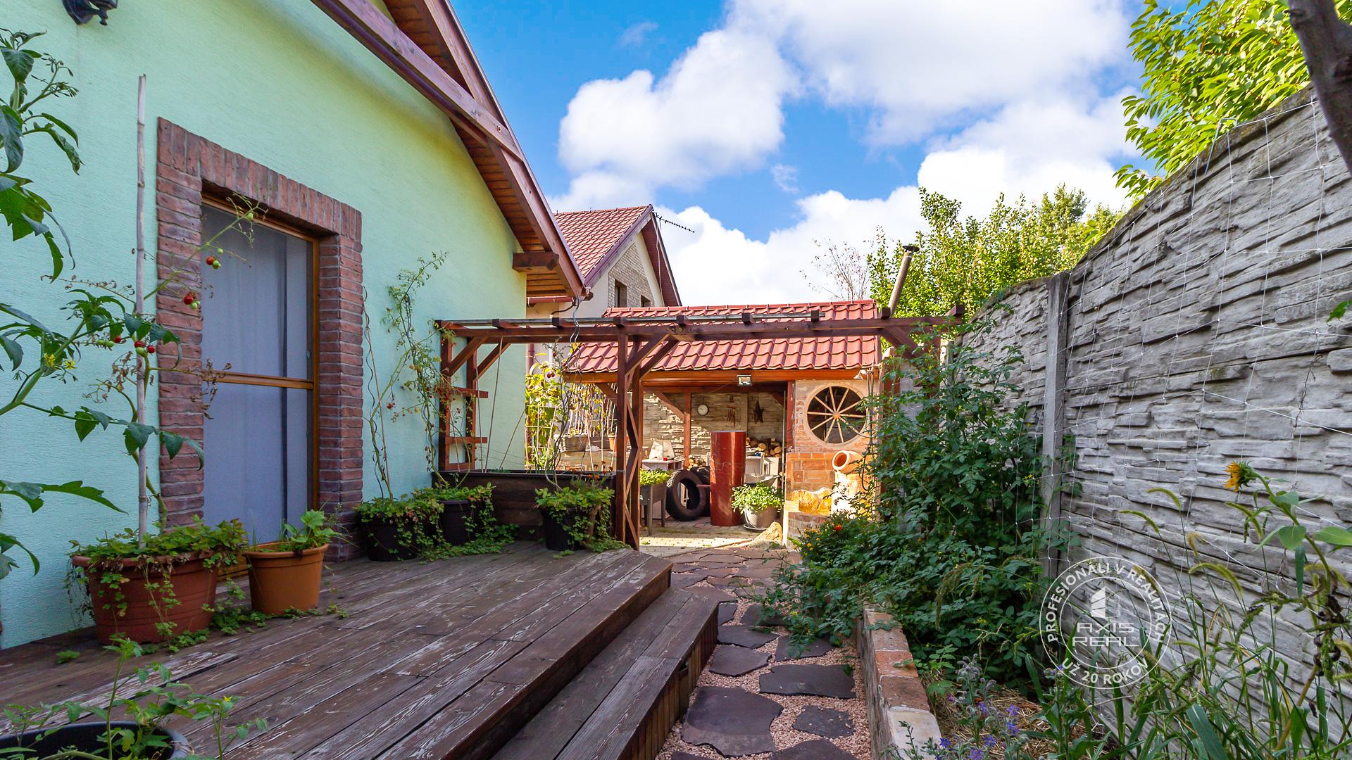 Na oplotenom pozemku so vstupom cez bránu na diaľkové ovládanie sa nachádza priestor na parkovanie pre 2 osobné autá, altánok s vonkajším murovaným krbom a murovaným okrasným jazierkom s fontánou, množstvo murovaných vyvýšených záhonov pre možnosť pestovania domácej zeleniny prípadne kvetov, taktiež tu nájdete aj mladú slivku, čerešňu a množstvo okrasných kvetov a stromov ktoré poskytujú dostatok súkromia. O úložný priestor resp. dielňu je postarané vďaka priechodnej drevenej prístavbe pozdĺž celého domu o veľkosti cca 32m2.